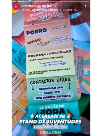“Si vas a consumir tené en cuenta estos consejos”, encabezaba el folleto cuestionado. “Acordate de estos consejos. El porro conseguilo de fuentes confiables. Con la cocaína y las pastillas andá de a poco y despacio. Tomá poquito para que ver cómo reacciona tu cuerpo”, subrayaba. Los flyers fueron entregados en mano en un stand de la Dirección de Políticas para Juventudes de Morón a quienes concurrieron el domingo último al predio Quinta Seré, en Castelar.