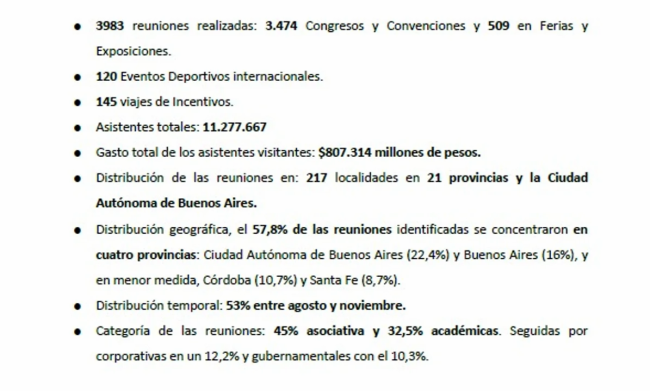 Además, el informe indica que el segmento reunió a más de 11 millones de asistentes durante todo ese año, se registró un gasto total de 807.314 millones de pesos, distribuidos en 217 localidades en 21 provincias, más la Ciudad de Buenos Aires. En este sentido, y teniendo en cuenta la distribución geográfica, un 57,8 % de las reuniones identificadas fueron en la Ciudad Autónoma de Buenos Aires (22,4 %), Provincia de Buenos Aires (16 %), Córdoba (10.7 %) y Santa Fe (8.7 %).