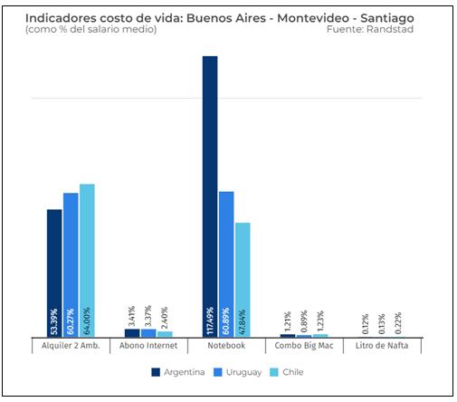 El relevamiento de Randstad también indaga sobre algunos costos de productos y servicios que sirven de referencia para tener una idea básica del costo de vida en Buenos Aires, Montevideo y Santiago que se muestran a continuación como un porcentaje de los valores del salario bruto medio de 786.667 pesos argentinos, 58.075 uruguayos y 625.000 chilenos, respectivamente.
